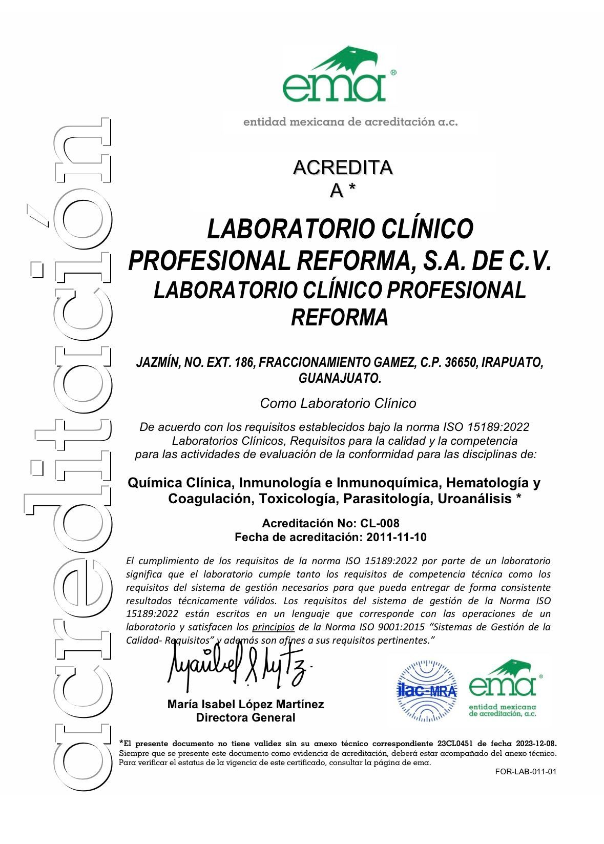 con más de 28 años de experiencia, acreditado por la EMA para exámenes indicados en el escrito de la acreditación CL-008 a partir del 2011-08-21. Coordinamos nuestros recursos materiales y humanos para obtener resultados analíticos de calidad que permitan satisfacer plenamente las necesidades del paciente y el médico.